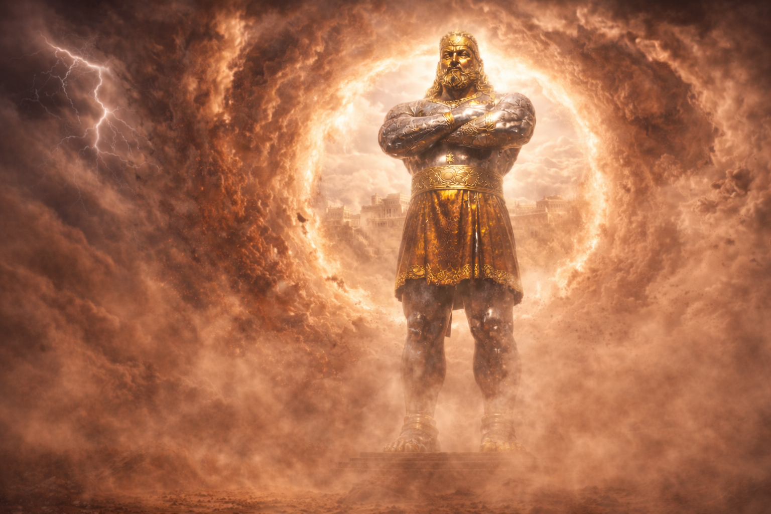 This is a still frame from the movie, showing a dramatized version of the image of the dream of Nebuchadnezzar. this shows the scales being tipped against the kingdoms of the world.