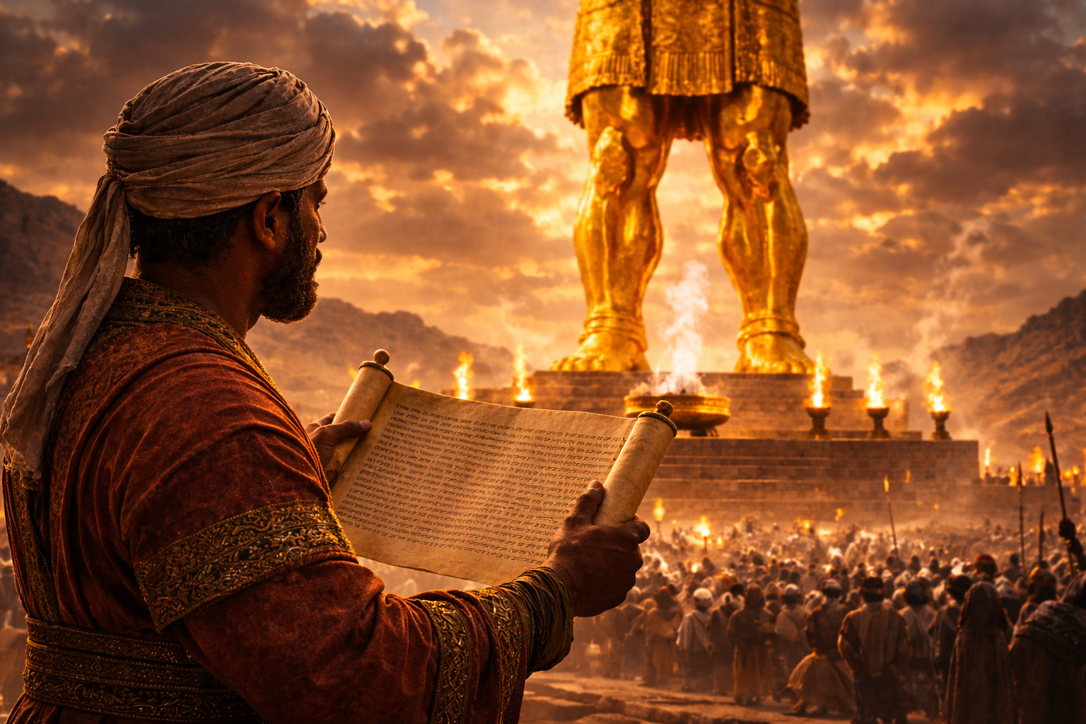 This is a still frame from a scene from the Movie of the dream of Nebuchadnezzar, where the announcer reads the decree found in Daniel Chapter 3. This is the section of the film where the we are introduced to the 3 Hebrew boys and the fiery furnace.